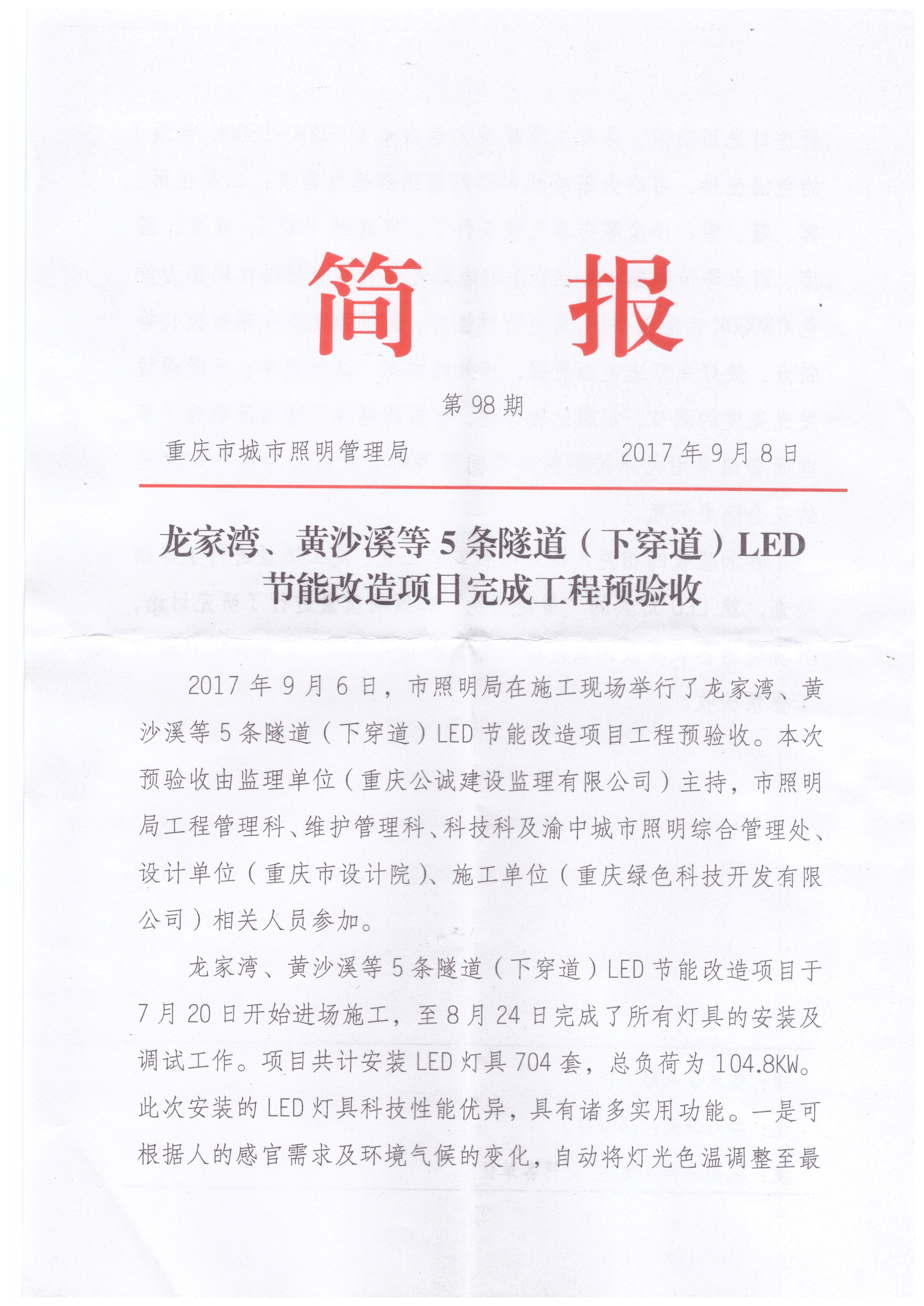 2017年7月31日,我司使用“中國創(chuàng)造”“互聯(lián)網(wǎng)+”多色溫防霧霾LED全智能路燈在重慶市龍家灣、黃沙溪、袁家崗、鵝嶺、陳家坪隧道實施科技節(jié)能改造工程已全面竣工。2017年9月6日,該項目建設(shè)單位重慶市城市照明管理局、監(jiān)理公司及設(shè)計公司對該項目進行了現(xiàn)場預(yù)驗收,參會人員對該創(chuàng)新專利產(chǎn)品作出了極高的評價。會后,重慶市城市照明管理局專門印發(fā)了《龍家灣、黃沙溪等5條隧道(下穿道)LED節(jié)能改造項目完成工程預(yù)驗收》簡報(附后),其上級主管部門重慶市城市管理委員會對其進行了新聞報道。